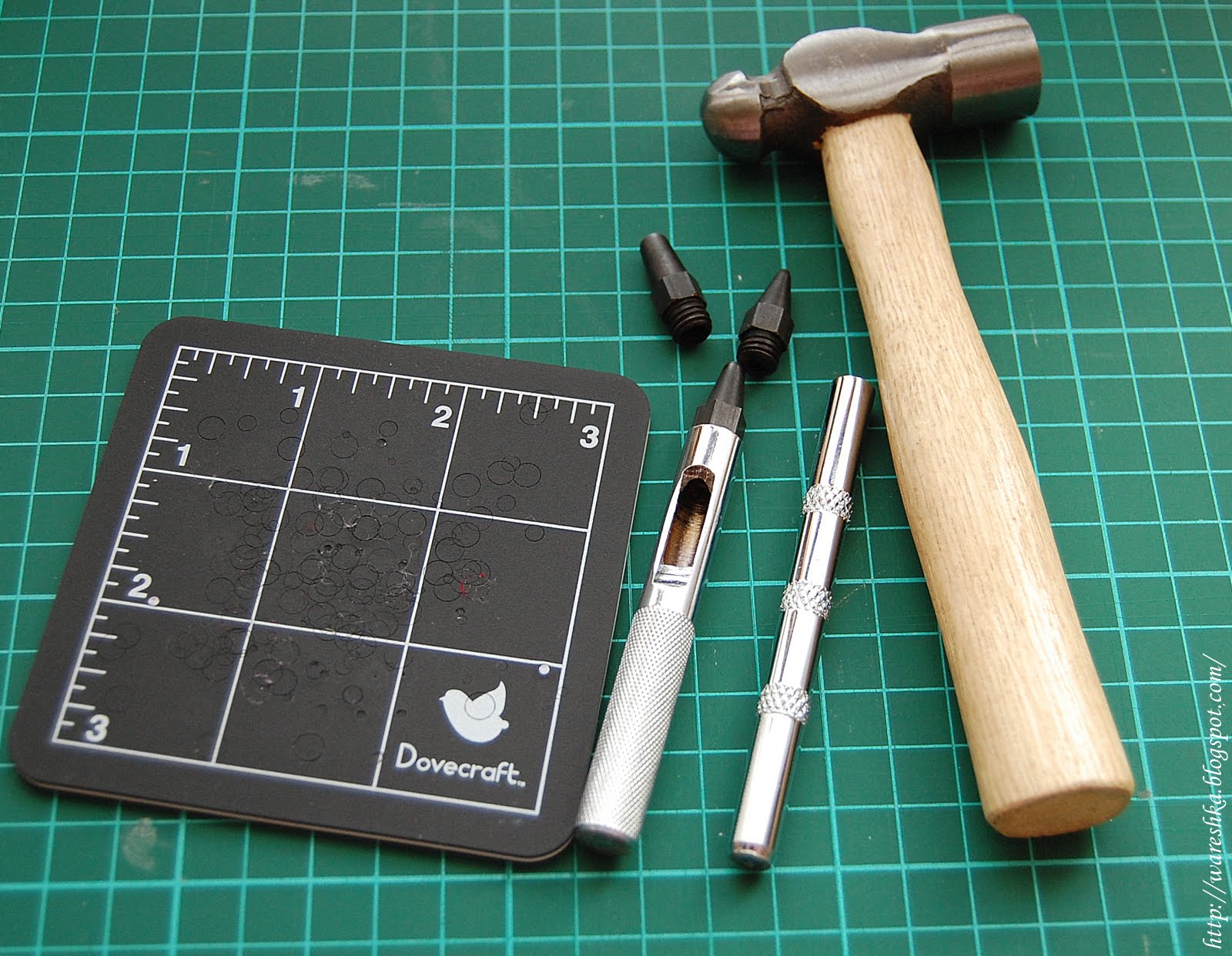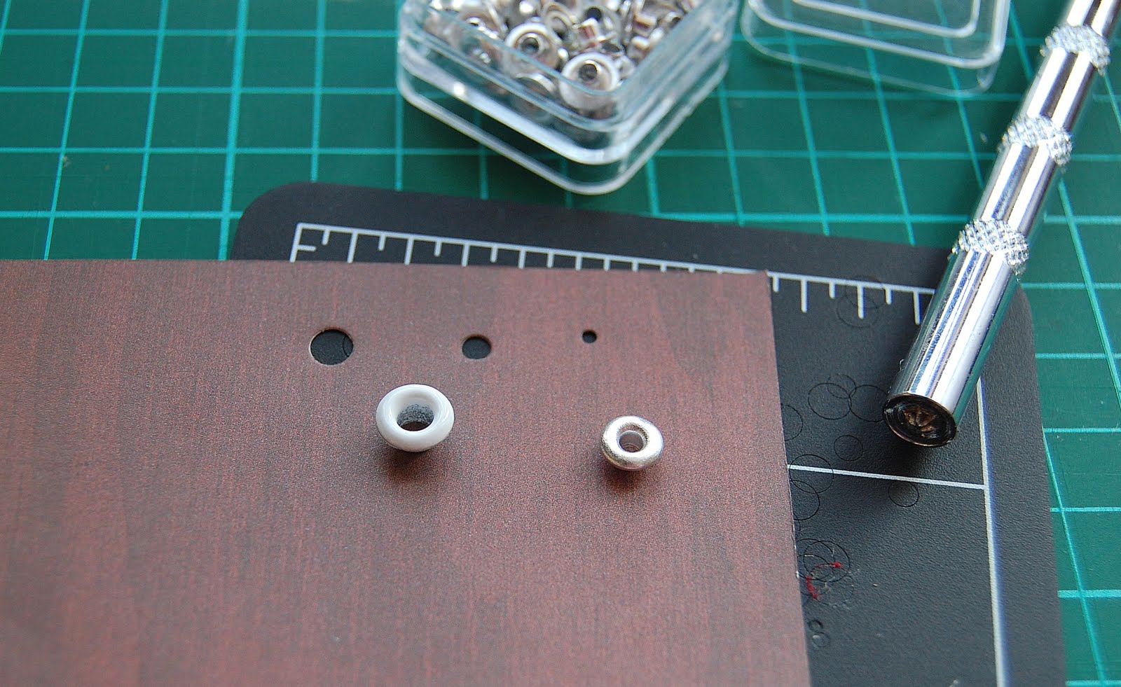 ОтветитьУдалитьУ меня вот этот самый Tools Instant Eyelet Setter. Преимущество - не нужен молоток. В ручке какое-то устройство, бьющее по насадке. Тыльной стороной ручки я ещё и прижимаю люверс изнутри, если надо, чтобы он был более плоским. Насадки (на фото в правом ряду коробочки) можно использовать для того, чтобы разбить на лепестки цельную ножку люверса. Тогда любой можно установить аккуратно.