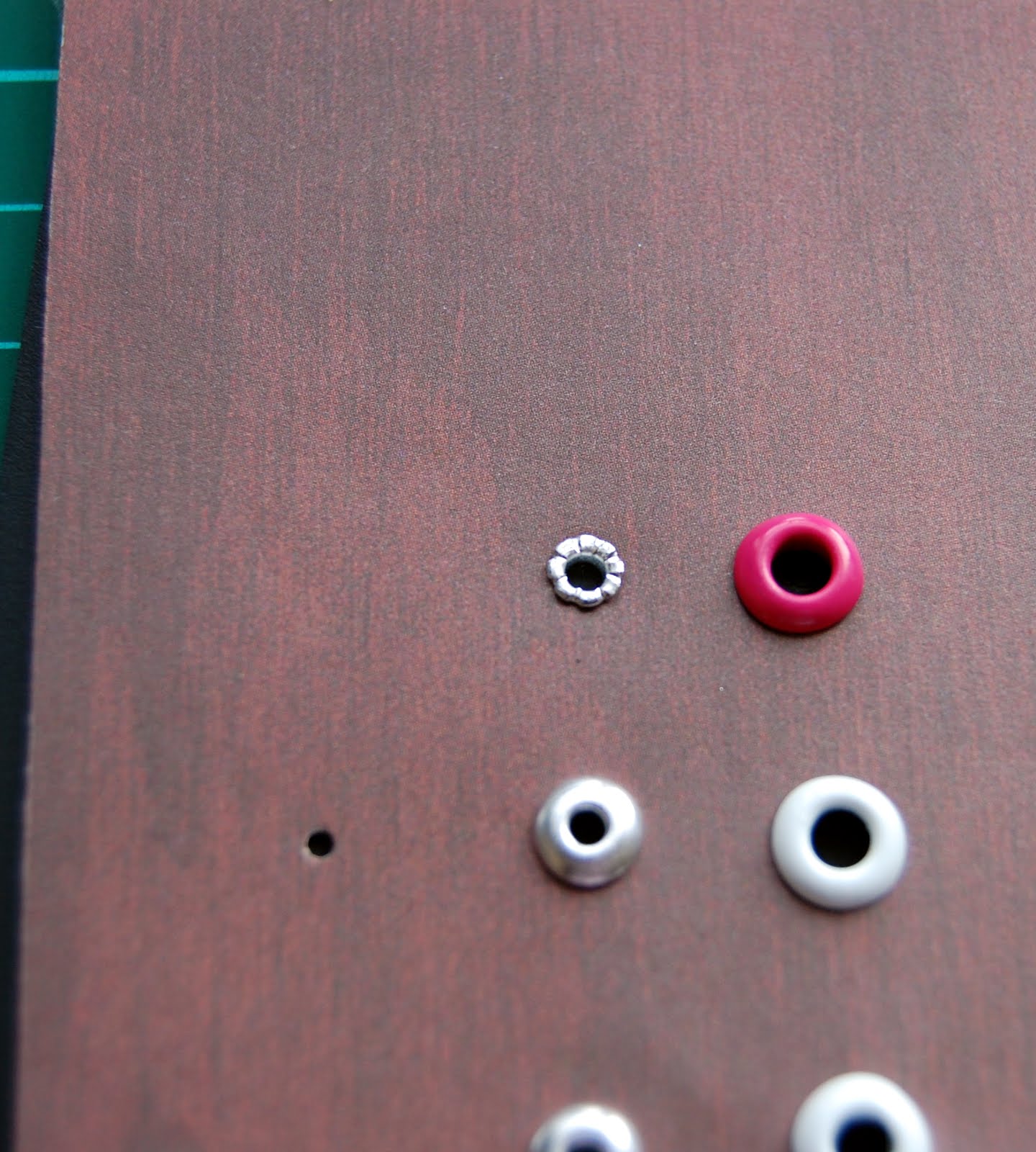 Аналогично поступаем с люверсами мелкого диаметра (установленный люверс слева от малинового):